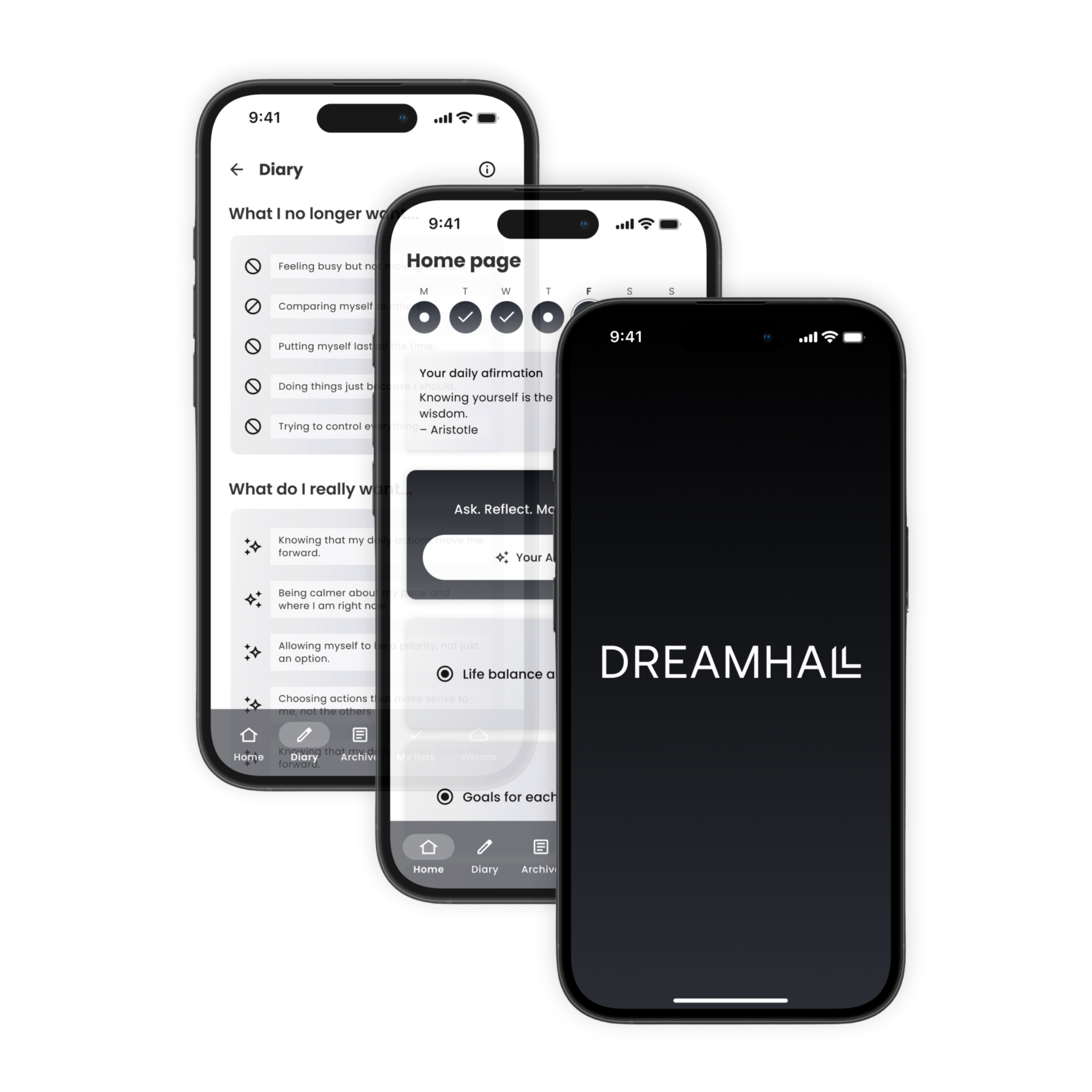 DREAMHALL is a guided self-reflection app for intentional thinking and conscious decisions.